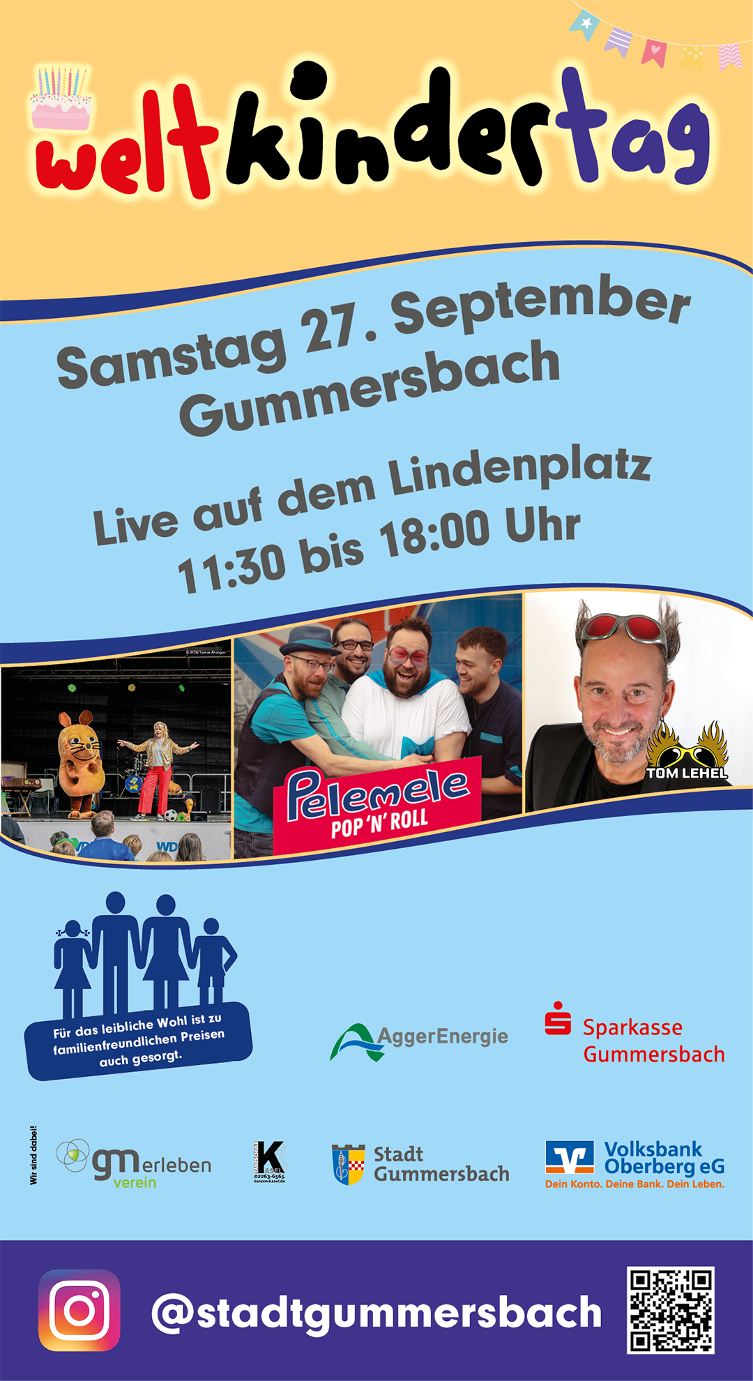 Der Fachbereich Jugend und Familie der Stadt Gummersbach organisiert in Zusammenarbeit mit seinen Kooperationspartnern Tanzzentrum Kasel, Volksbank Oberberg, Sparkasse Gummersbach, GMerleben und AggerEnergie zum 20-ten Mal den Weltkindertag in der Gummersbacher Innenstadt. Unter dem Motto „Geburtstagsparty“ mit Bewegungs-, Spiel- und Kreativstraße, wollen wir den 20. Geburtstag der größten Veranstaltung für Kinder in der Kreisstadt gemeinsam mit Ihnen begehen. Zu diesem Zweck wird es ein vielfältiges Bühnenprogramm mit kleinen und großen Stars aus Gummersbach und der Umgebung geben. Es treten verschiedene Künstler auf, es gibt eine Geburtstagsrallye, Seilklettern auf der Moltkestraße, ein Rückblick auf 20 Jahre Weltkindertag in Gummersbach, und viele Aktionen/Stände zum o.g. Motto.